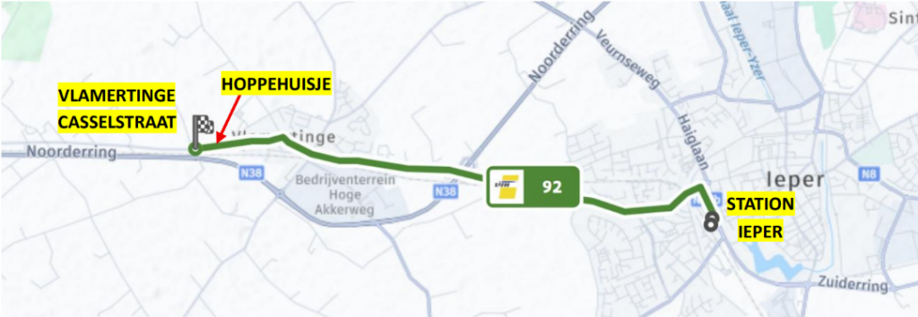 De vakantiewoning is ook vlot bereikbaar met het openbaar vervoer. Je kan met de trein rijden tot het station van Ieper, vervolgens neem je buslijn 92 richting Poperinge, afstappen doe je dan in “Vlamertinge Casselstraat”, de bus stopt op 50 meter van het Hoppehuisje.